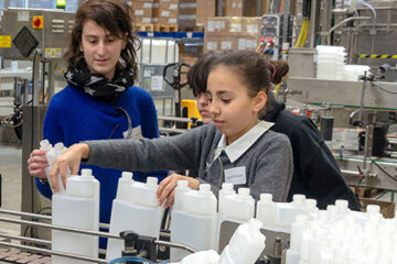 Als Nächstes wurden die Schülerinnen in der Abteilung Maschinenabfüllung erwartet. Schließlich müssen die hergestellten Produkte in entsprechende Flaschen oder Kanister abgefüllt werden. Das geschieht bei uns mit hochmodernen Maschinen, die hohe Abfüllmengen erreichen können. Trotz aller Modernität spielt der Mensch dabei nach wie vor eine große Rolle – er muss mit hoher Aufmerksamkeit die Maschinen bedienen und kontrollieren.