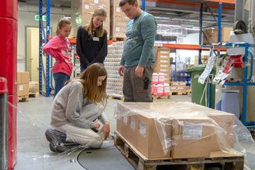 Die fertig abgepackten Kartons müssen nun palettenweise in Folie gewickelt werden, bevor ein Logistikunternehmen sie entgegennimmt und an den Zielkunden ausliefert. Die große Herausforderung für die Mädchen war es, die Palettenwickelmaschine in den Griff zu bekommen. Mit viel Übung und fachlicher Anweisung vom Profi haben sich einige der Mädchen mit Bravour geschlagen.